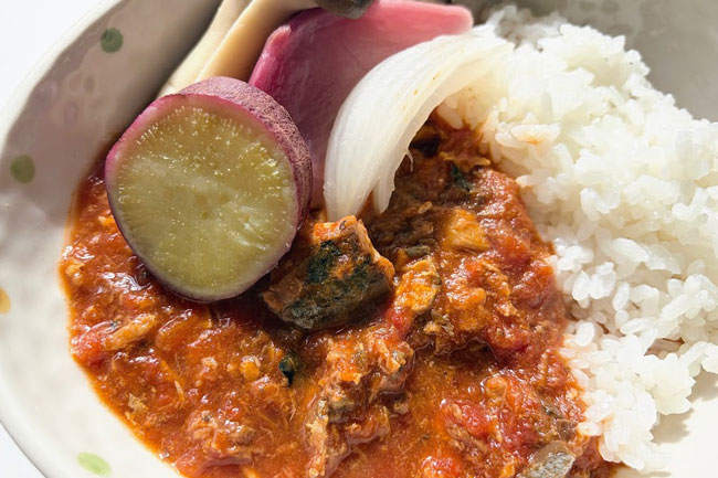 トマトの酸味と汁ごと使用する鯖缶のうまみが、長時間煮込むことなくカレーにコクを出してくれます。