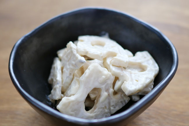 れんこんは薄めのいちょう切りにしてサッとゆでて、ザルに上げます。シャキシャキ感を残すため、ゆですぎないようにします。マスカルポーネチーズをクリーム状にし、調味料も混ぜ、れんこんを和えて出来上がり。