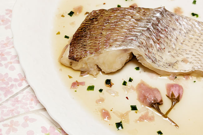 桜花の塩漬けを水に浸けて塩抜きすると、桜の風味の溶けこんだ水ができます。その水とだし汁を混ぜた煮汁で桜鯛を煮ます。白だしを使うと、色目をより楽しめます。