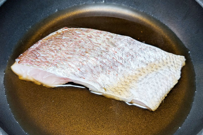 5./鯛の表面をキッチンペーパーでぬぐい、皮目を上にして、4のだし汁の中に入れる。