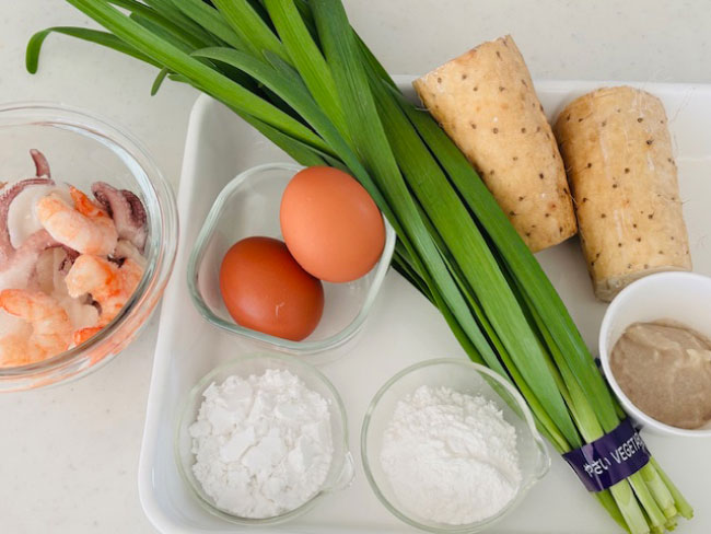1./山芋は、皮つきのまますりおろす。または、適当な大きさに切りフードプロセッサーで滑らかになるまで撹拌する。ニラは、5cmぐらいの長さに切る。シーフードは、食べやすい大きさに切っておく。