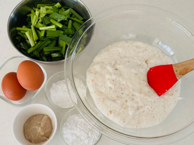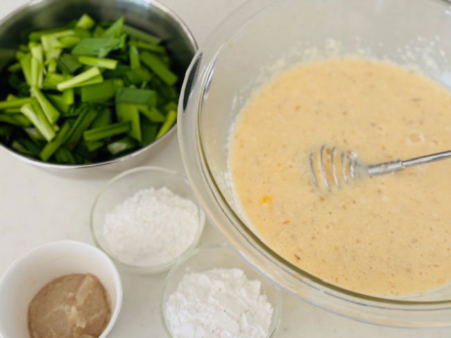 2./すりおろした山芋に卵と米粉、片栗粉、玉ねぎ塩麹を加えてよく混ぜ合わせる。