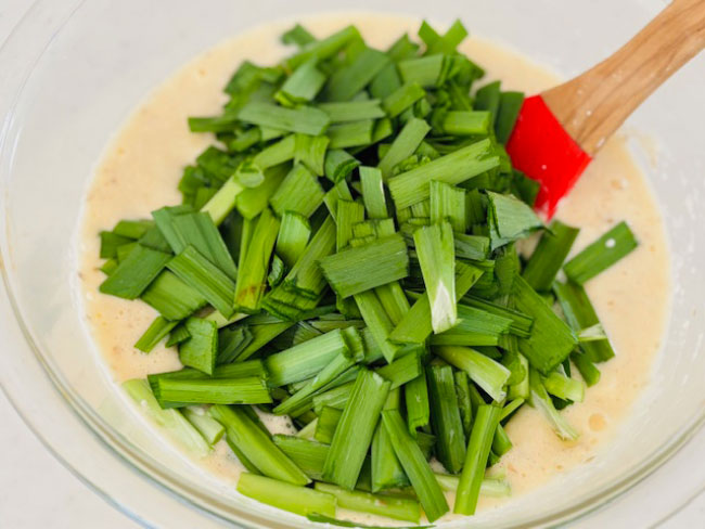 3./2がよく混ざったら、ニラを加えて全体をさっくりと混ぜる。