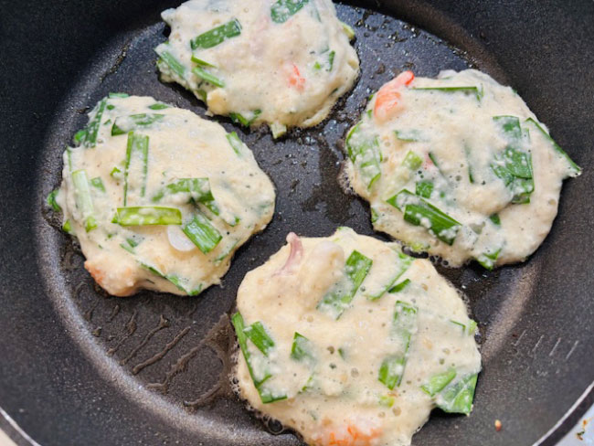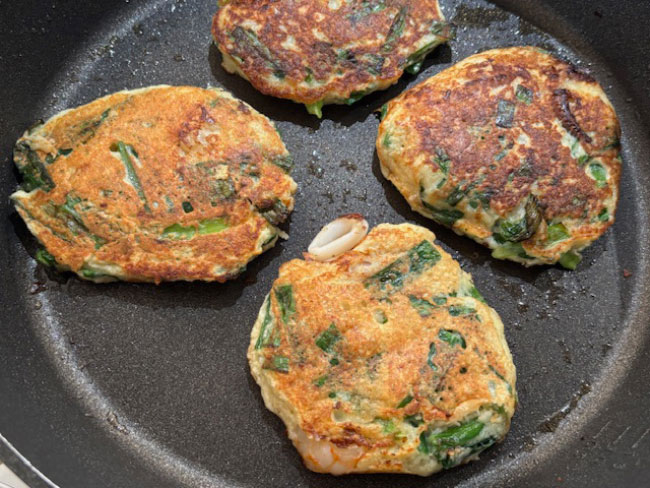 6./フライパンにごま油大さじ2を入れて、中火で温める。ごま油の香りが立ってきたら、4のタネを流し入れて焼く。周りに火が通ってきて、フライパンを傾けると全体が動くようになったら、上下を返して焼く。大きく1枚で焼く場合は、フライパンに蓋をして焼くことで全体に火が通りやすくなる。