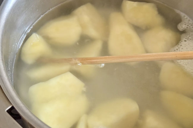 4./鍋に、茹でたさつまいもと水を入れ、沸かし、数分煮る。