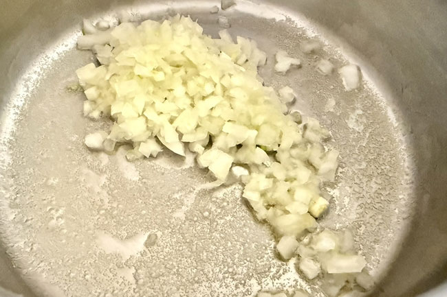 3./洗った鍋にバターを入れ、火にかけ、玉ねぎを香りよく炒める。