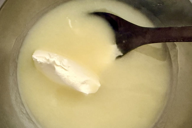 6./ボウルにサワークリームと、先のスープおたま数杯分を入れる。サワークリームをボウルの中で溶かしたのち、すべて鍋に戻し入れ、温める。