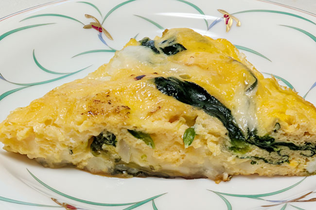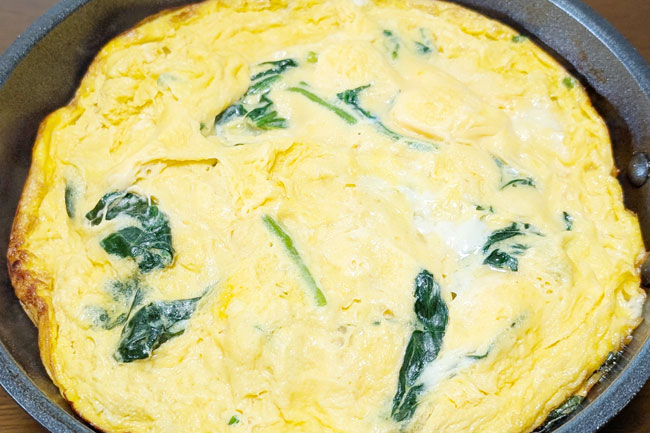 今回は定番の具材であるチーズ、ベーコン、タマネギ、ホウレンソウを選びました。分量は精密でなくても大丈夫。下記は目安です。卵の量で全体の厚みを調節してください。ほかには、ひき肉やシーフード、ジャガイモ、カボチャなどの野菜、キノコ類などが使えます。