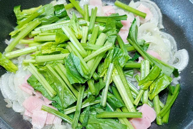 3./ホウレンソウを、茎部は4センチ、葉部は5センチほどの長さに切る。2のベーコンに火が通ったら、ホウレンソウの茎部を加えて炒める。
