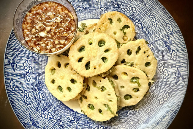 ジョンは、肉や魚介類、野菜などを薄切りやみじん切りにし、小麦粉をまぶし、たまごをつけて焼いた韓国料理。家庭料理からお祝いの席まで、幅広いシーンで親しまれています。今回は春菊のほろ苦さと香りをれんこんの食感とほのかな甘みではさみ、たまごの旨みを加え、包んで焼き揚げます。れんこんには、はさみ焼きやはさみ揚げなどがありますが、丸い穴やふちからのぞく春菊の緑も、この料理のアクセントのひとつです。