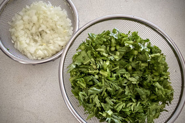 2./春菊を1cm弱の長さに刻む。玉ねぎを刻む。